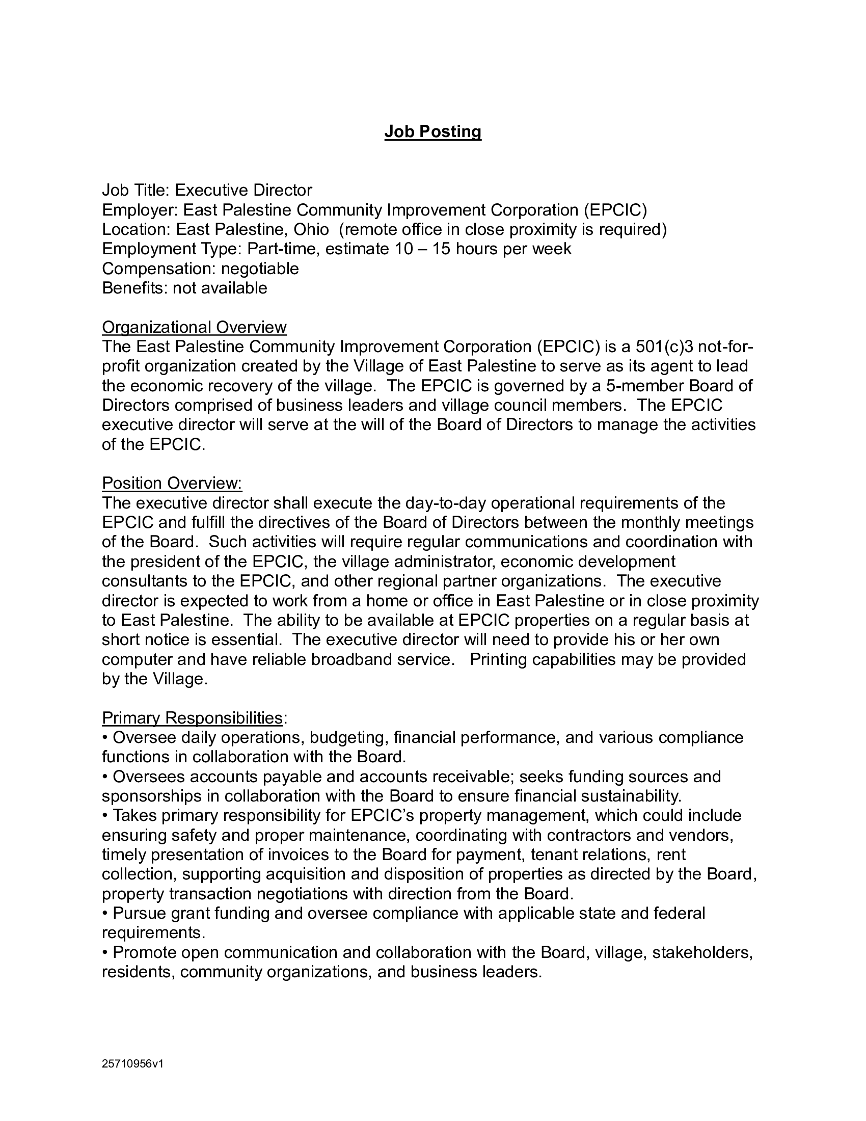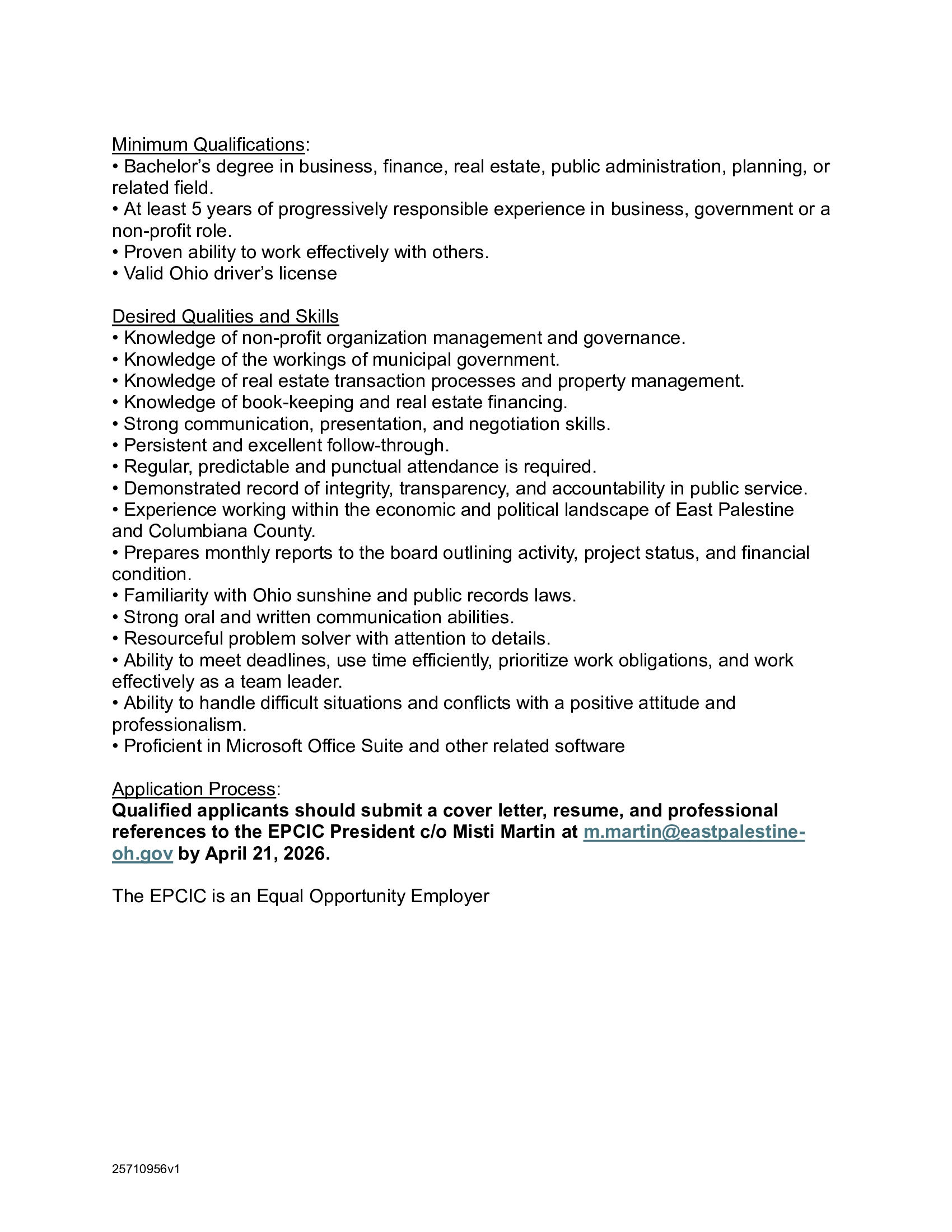 The East Palestine Community Improvement Corporation (EPCIC) is accepting letters of interest for a recently vacated board of directors position. Qualified persons must either be a resident of East Palestine or own a business in the Village. Letters of interest can be emailed to m.martin@eastpalestine-oh.gov and must be received by Tuesday, April 14th @ 4pm.